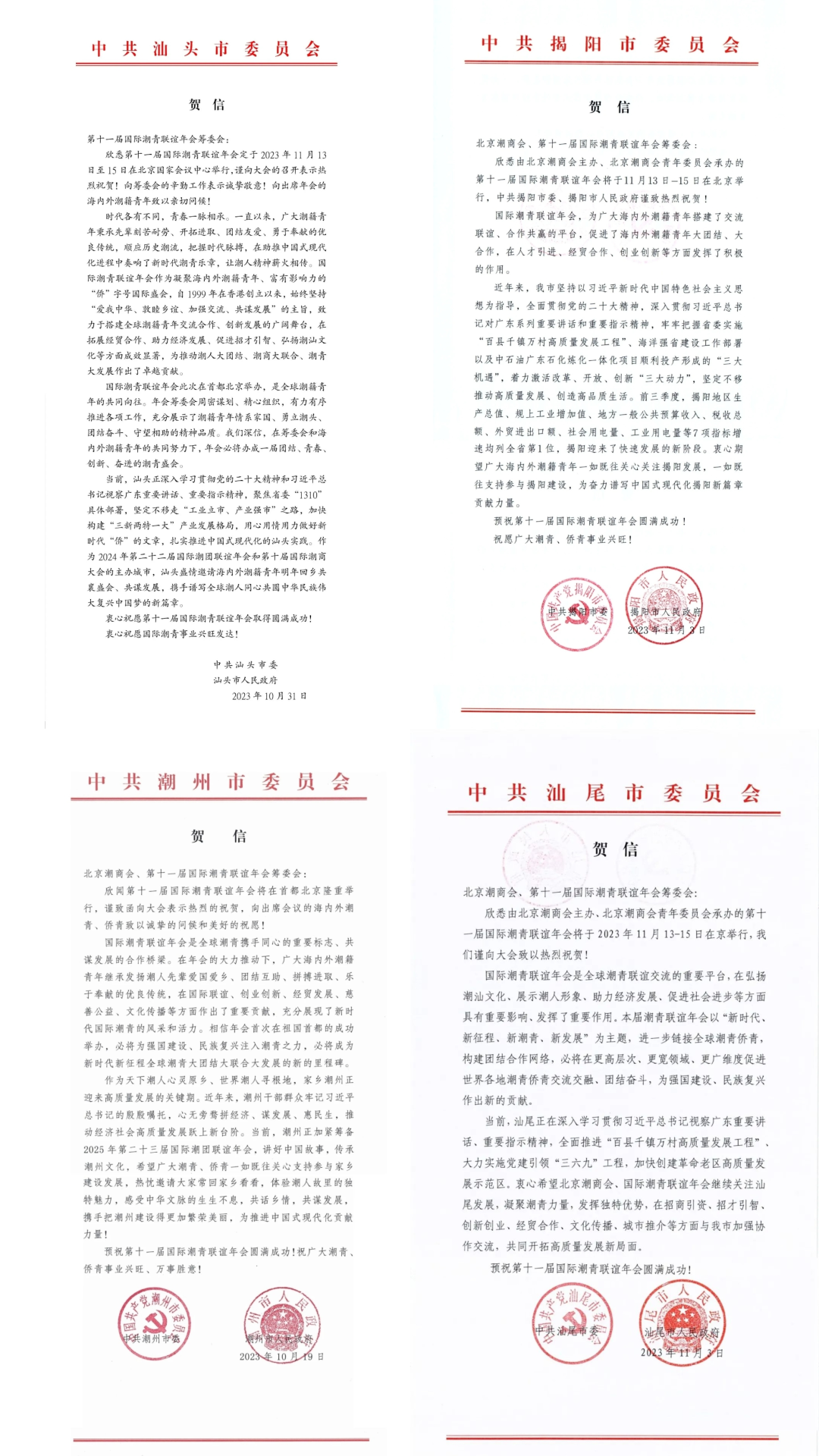 中共汕头市委、汕头市人民政府在贺信中特别指出:国际潮青联谊年会此次在首都北京举办,是全球潮籍青年的共同向往。年会筹委会周密谋划、精心组织,有力有序推进各项工作,充分展示了潮籍青年情系家国、勇立潮头、团结奋斗、守望相助的精神品质。我们深信,在筹委会和海内外潮籍青年的共同努力下,年会必将办成一届团结、青春、创新、奋进的潮青盛会。作为2024年第二十二届国际潮团联谊年会和第十届国际潮商大会的主办城市,汕头盛情邀请海内外潮籍青年明年回乡共襄盛会、共谋发展,携手谱写全球潮人同心共圆中华民族伟大复兴中国梦的新篇章。