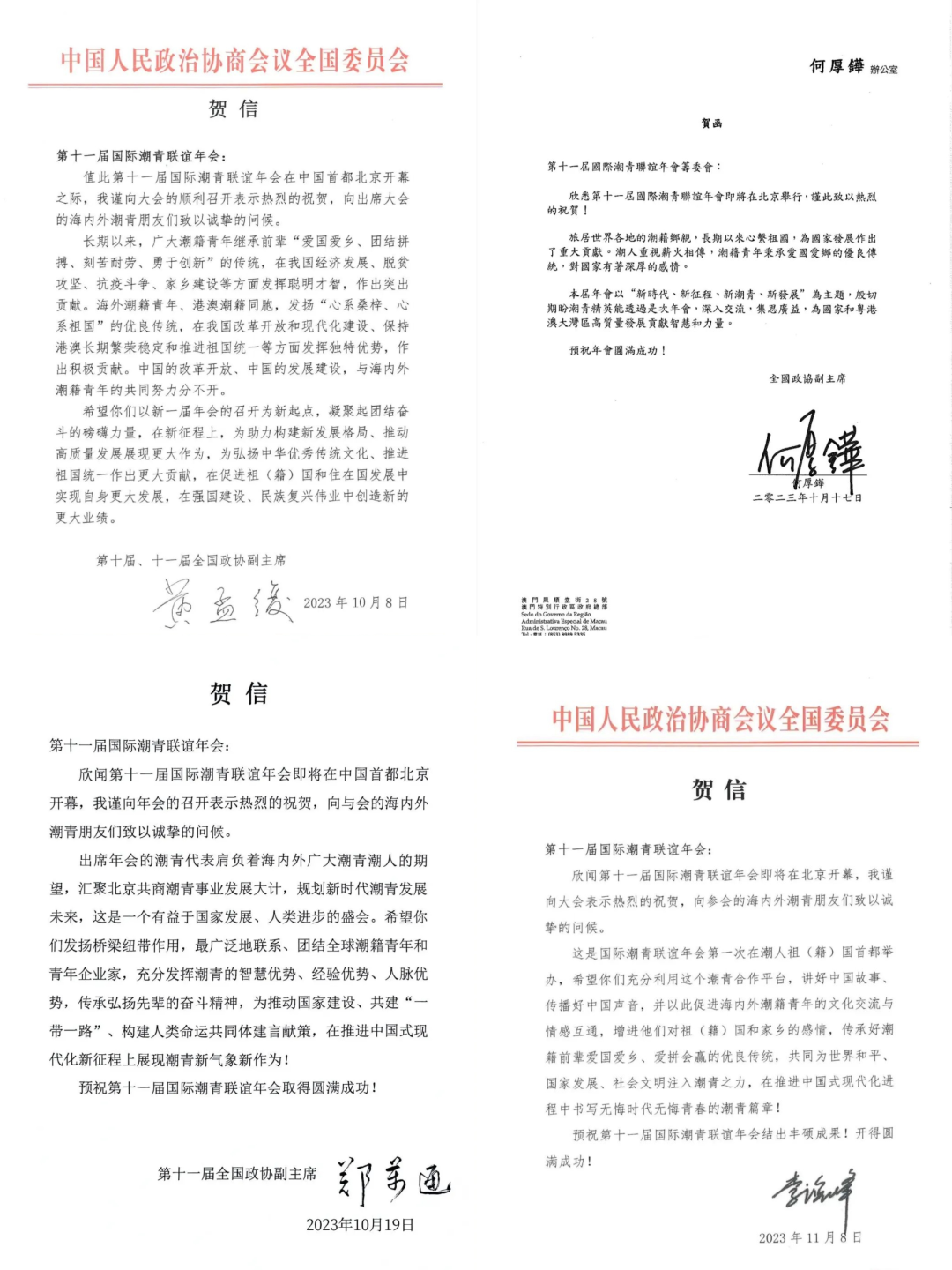 第十一届国际潮青联谊年会收到大量贺信贺词