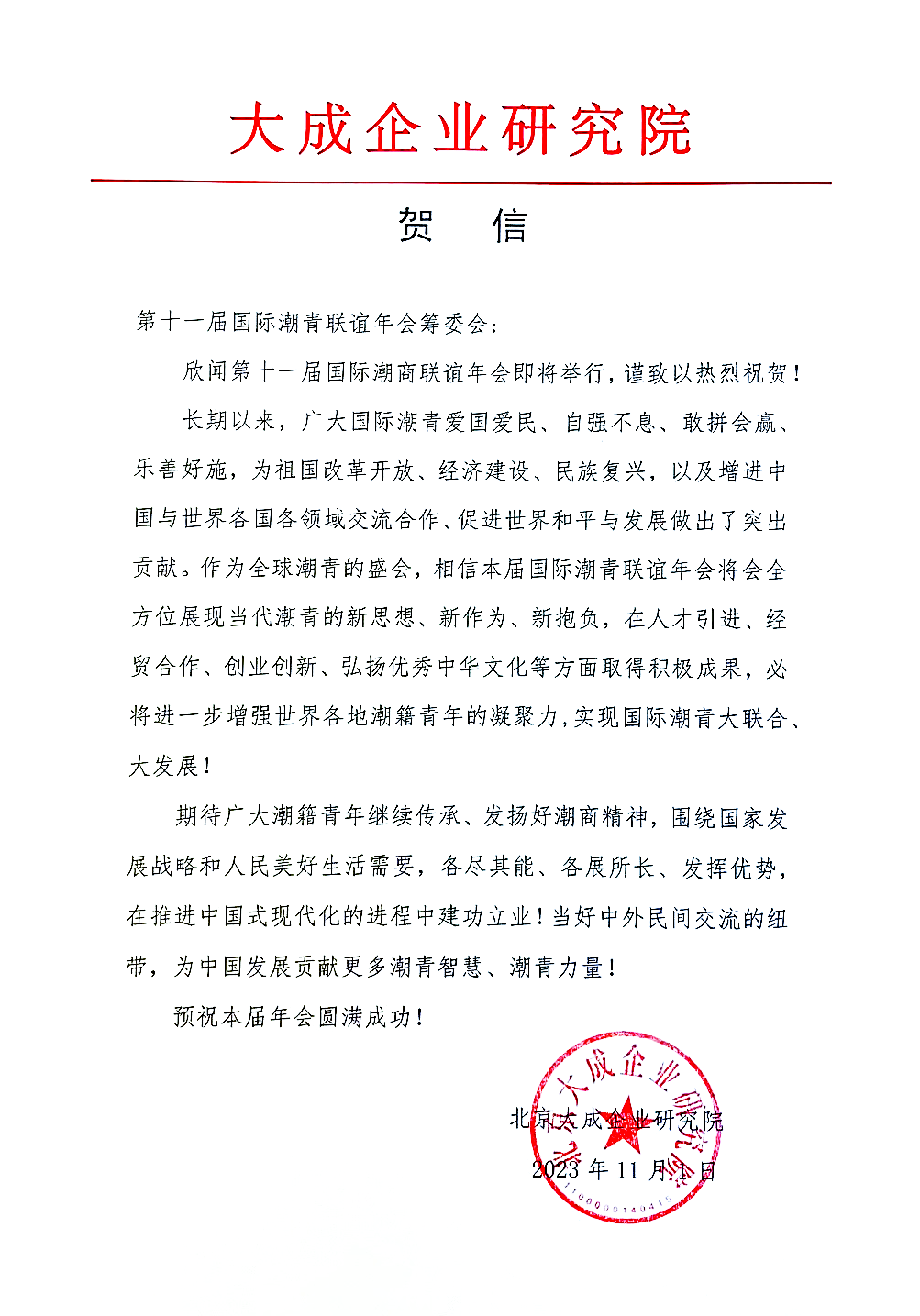 第十一届国际潮青联谊年会将于2023年11月13日-15日在北京召开。本期贺信专栏推出中国政策科学研究会、大成企业研究院来贺,与海内外读者和潮人共贺盛会,共享喜悦。